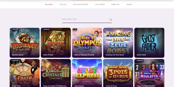 Vores spil-lobby er en af hovedårsagerne til, at spillere vælger LuckyVegas. Vi tilbyder 8000 spil, der dækker slots, roulette, blackjack, baccarat, bingo, videopoker, live spil, jackpot-titler og skrabelodder. Det giver danske brugere et stort valg mellem hurtigt lavindsatsspil og længere sessioner ved bordspil. RTP er ikke skjult, fordi spillets RTP vises i spillereglerne inde i hvert spil.
